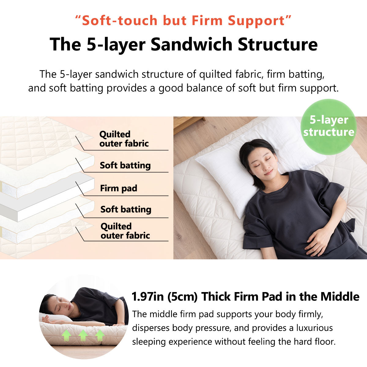 Obermaterial: Polyester. Innere Füllung: (oben und unten) Polyester-Faser-Füllung 1,5 kg (3,31 lb), (Mitte) Polyester komprimiert Pad 2,25 kg (4,96 lb).