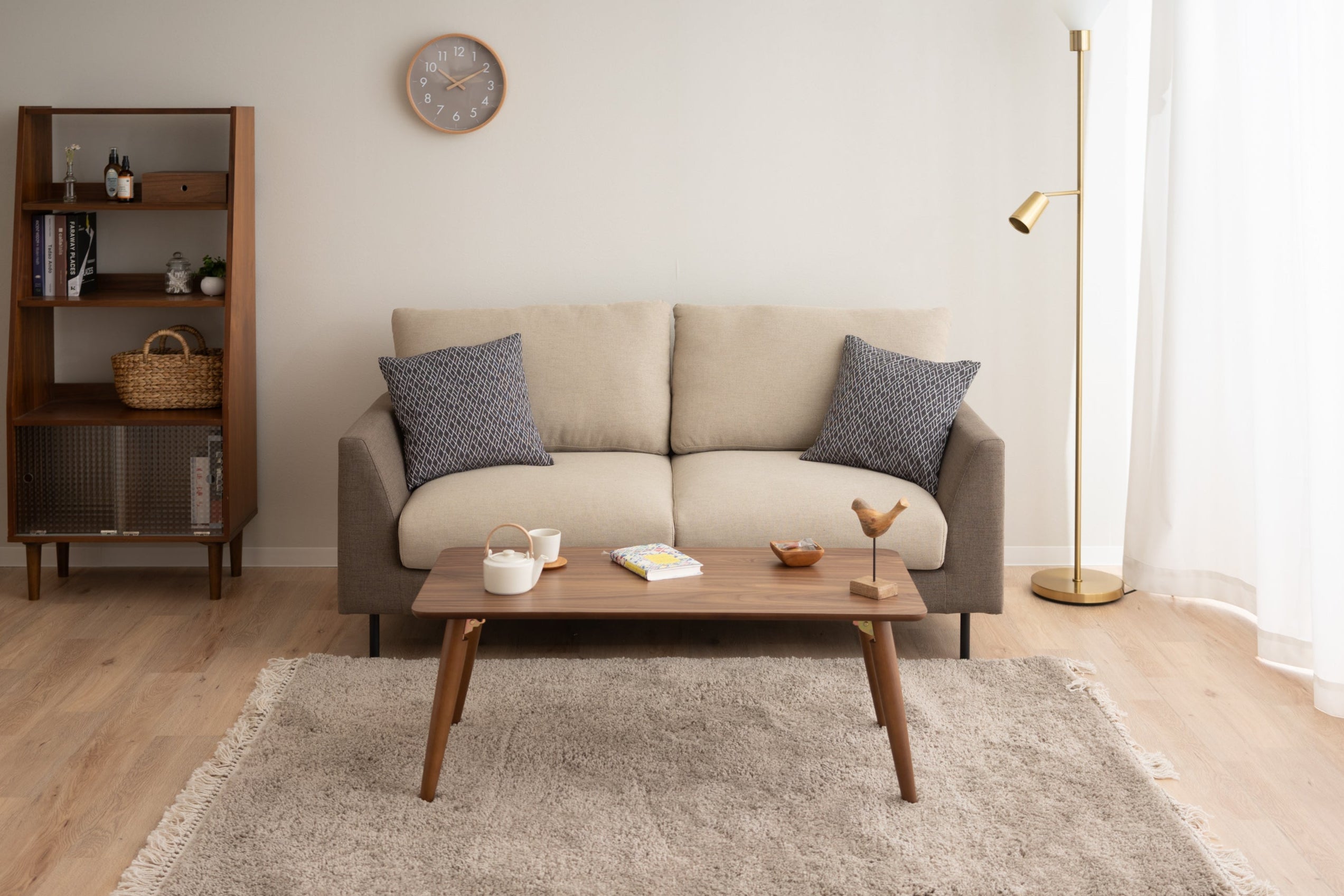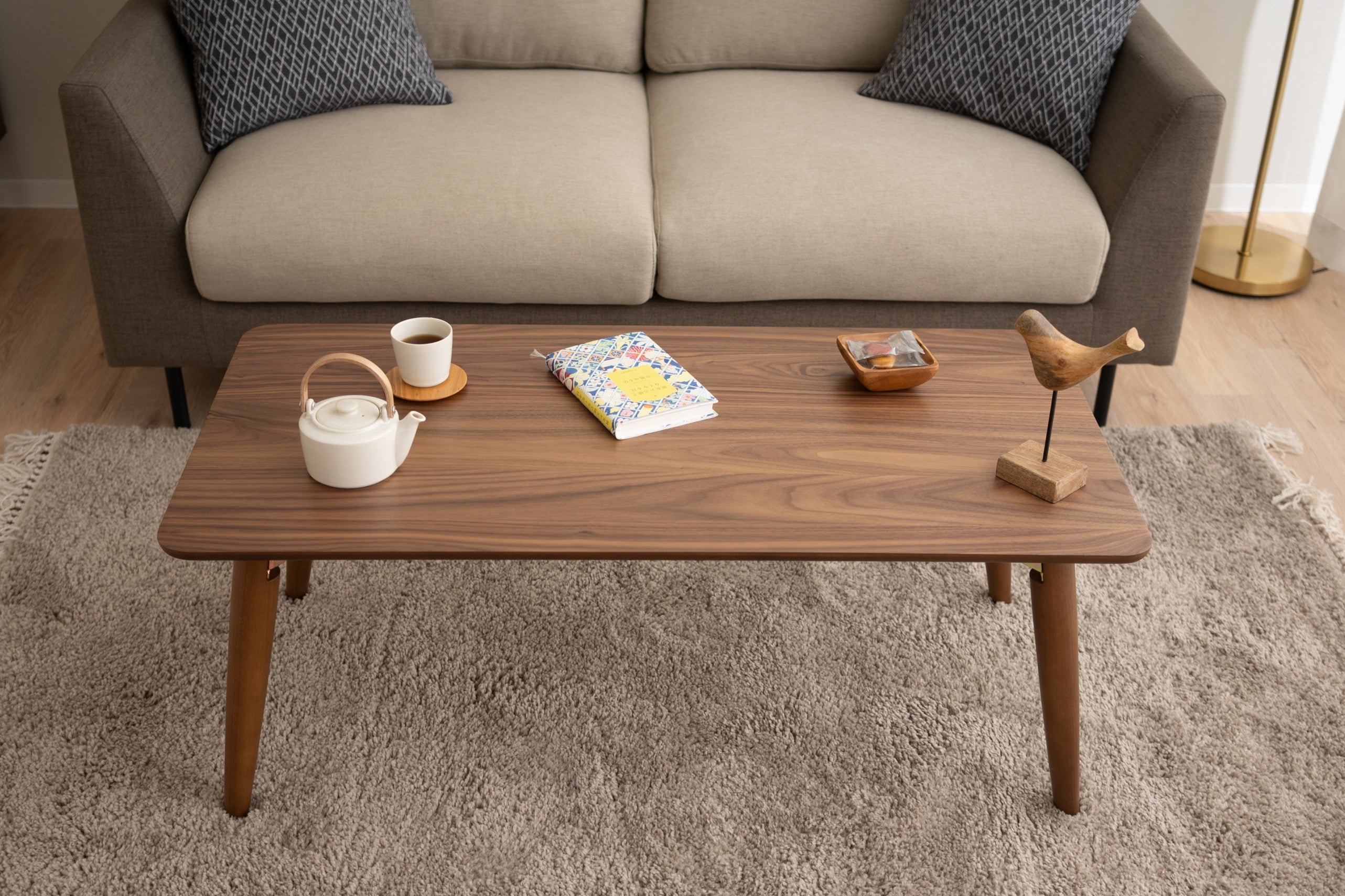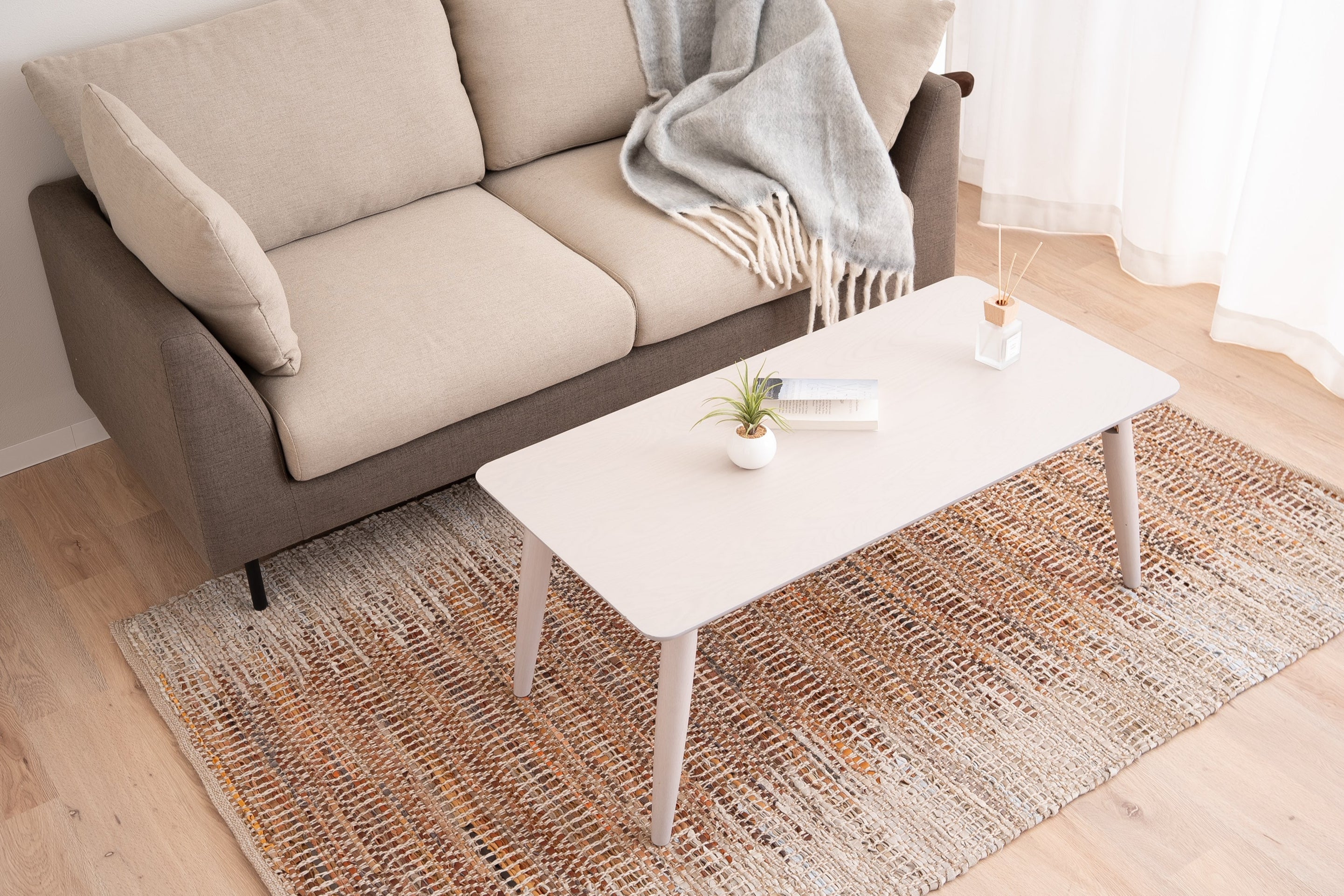 Die obere Platte besteht aus Holzwerkstoff mit natürlichem Holzfurnier und sitzt auf Beinen aus massivem Gummibaumholz. (Aufgrund der Verwendung von natürlichem Material variieren die Holzmaserung und die Farbe jeder Einheit.)