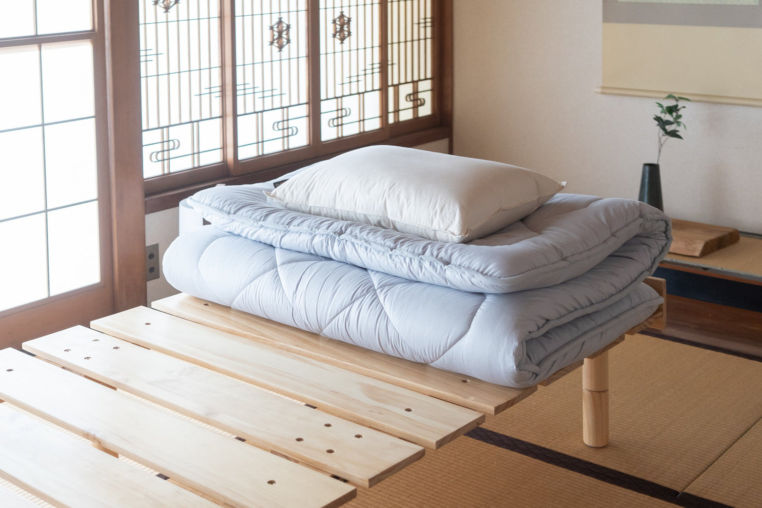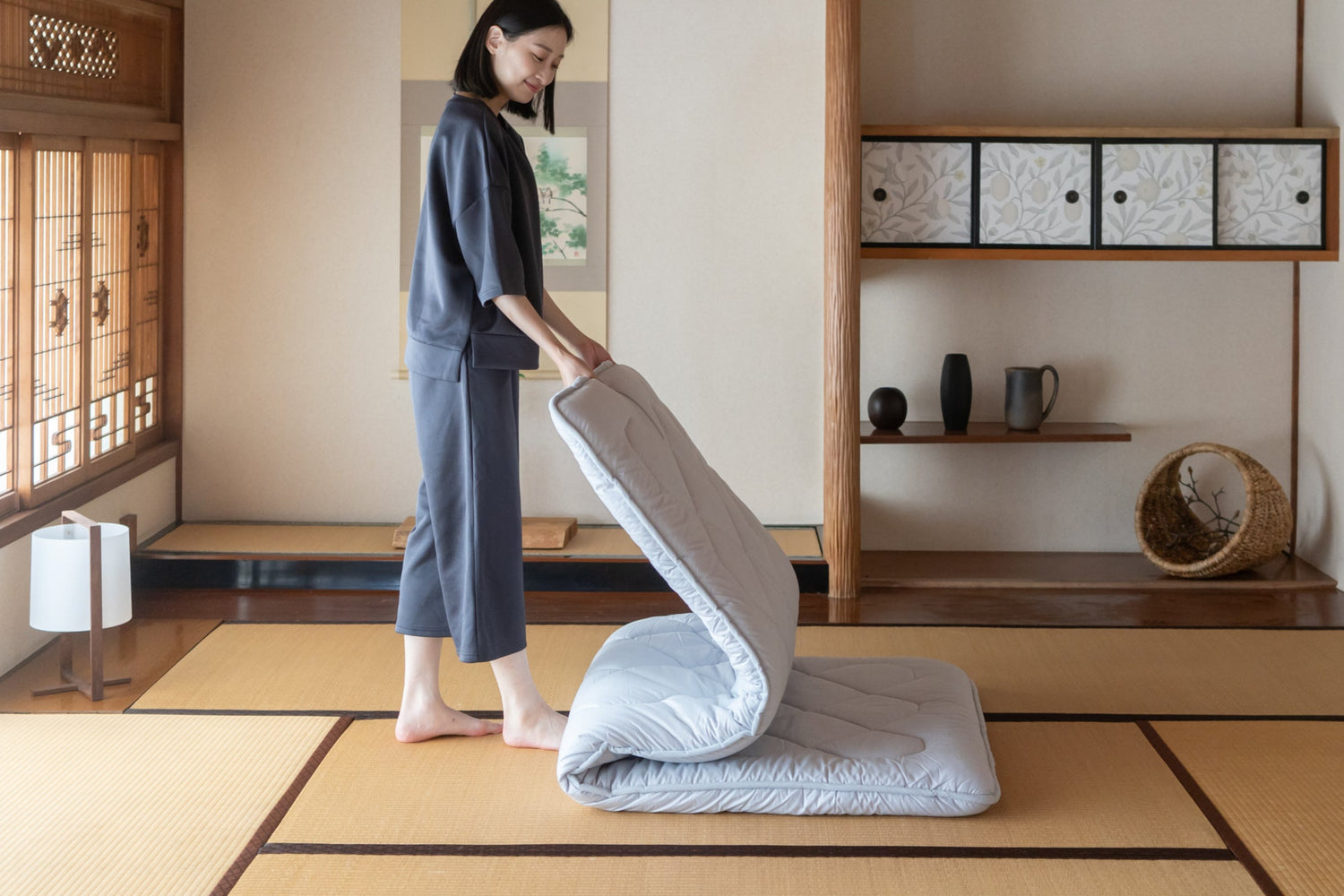 Für die Mittelfüllung wird Spanschaum verwendet, der sehr belastbar und langlebig ist. Beschichtet mit separat gesteppten Polstern mit gutem Volumen oben und unten. Die traditionelle japanische 3-Lagen-Struktur bietet maximalen Schlafkomfort.