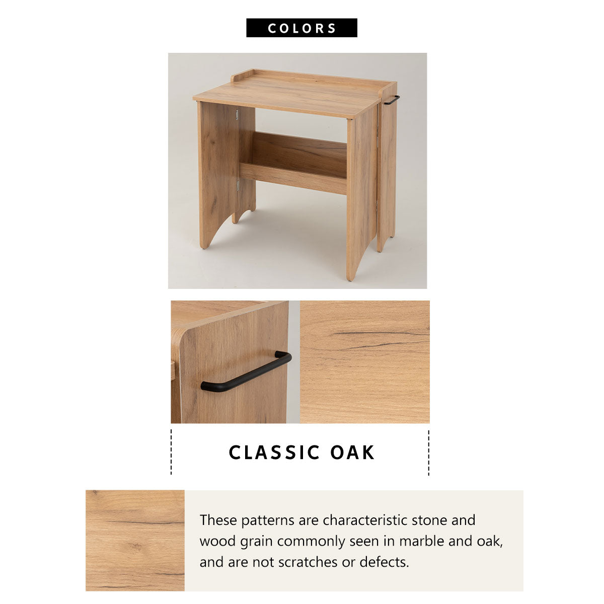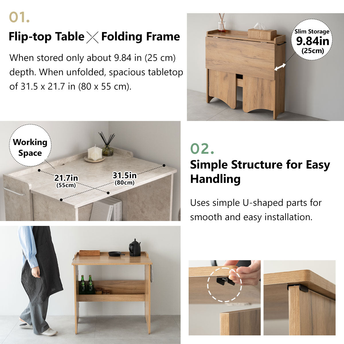 Heben Sie einfach die Tischplatte an und klappen Sie die linken und rechten Rahmen ein. Die einfachen U-förmigen Teile ermöglichen eine einfache und problemlose Montage. Die Tiefe im verstauten Zustand beträgt ca. 25 cm (9,84 zoll). Ausgeklappt ergibt sich eine großzügige Arbeitsfläche von 80 x 55 cm (31,5 x 21,7 zoll).