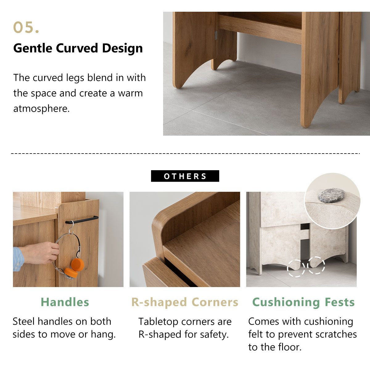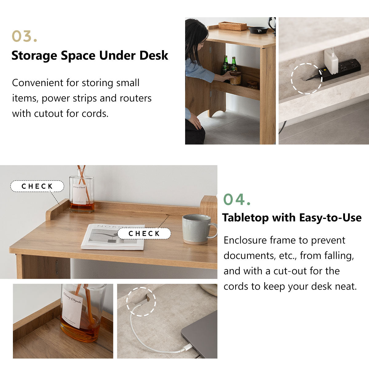 Der Fokus liegt auf Benutzerfreundlichkeit, Sicherheit, Komfort und Benutzerfreundlichkeit. Einfassungsrahmen verhindern das Herunterfallen von Kleinteilen, Smartphones usw. Stauraum unter dem Tisch. Aussparungen für Kabel in der Tischplatte und Stauraum für einen ordentlichen Schreibtisch. Griffe an beiden Seiten zum Aufhängen von Kleinteilen oder zum Transportieren. Polsterfilz schützt vor Kratzern auf dem Boden. R-förmige Ecken für mehr Sicherheit.