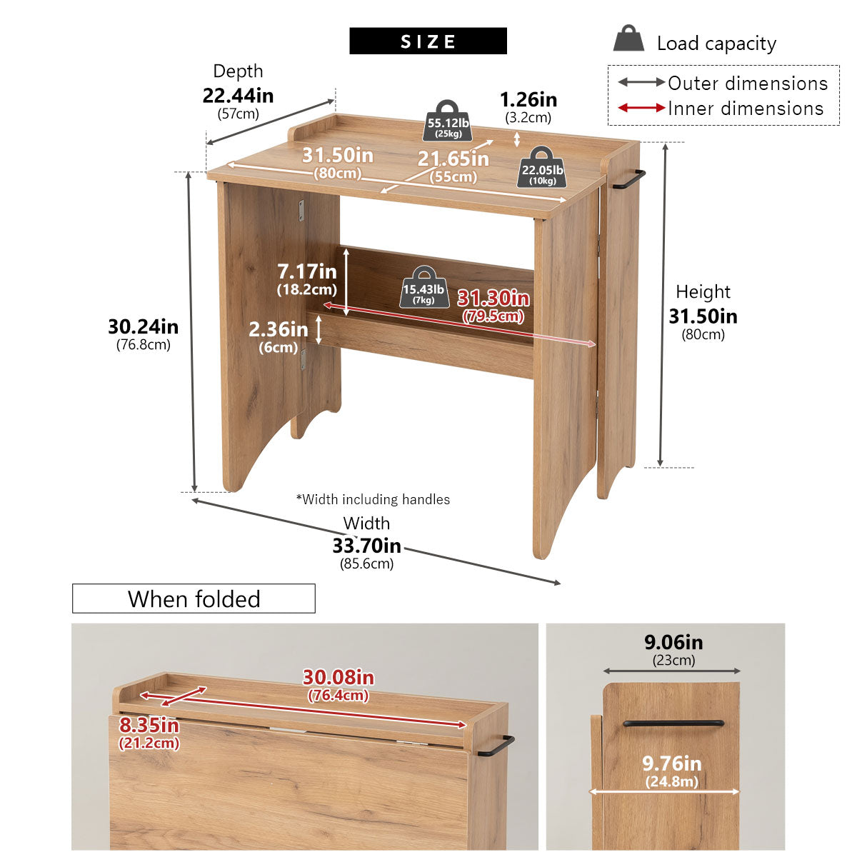 Maße (gebraucht): B 85,6 x T 57 x H 80 cm (W33,70 x D22,44 x H31,50 zoll) / (verstaut): B 85,6 x T 24,8 x H 80 cm (W33,70 x D9,76 x H31,50 zoll) / Tischplatte (klappbar): B 80 x T 33,8 x H 76,8 cm (W31,50 x 13,31 x 30,24 zoll). Materialien: Kunstharzfurnierfaserplatte (Melamin), Griffe: Stahl