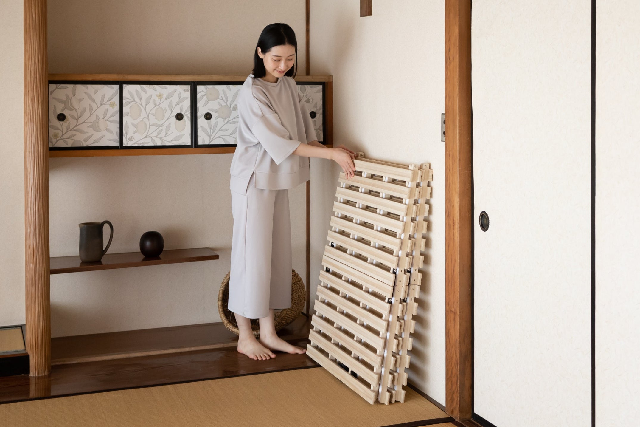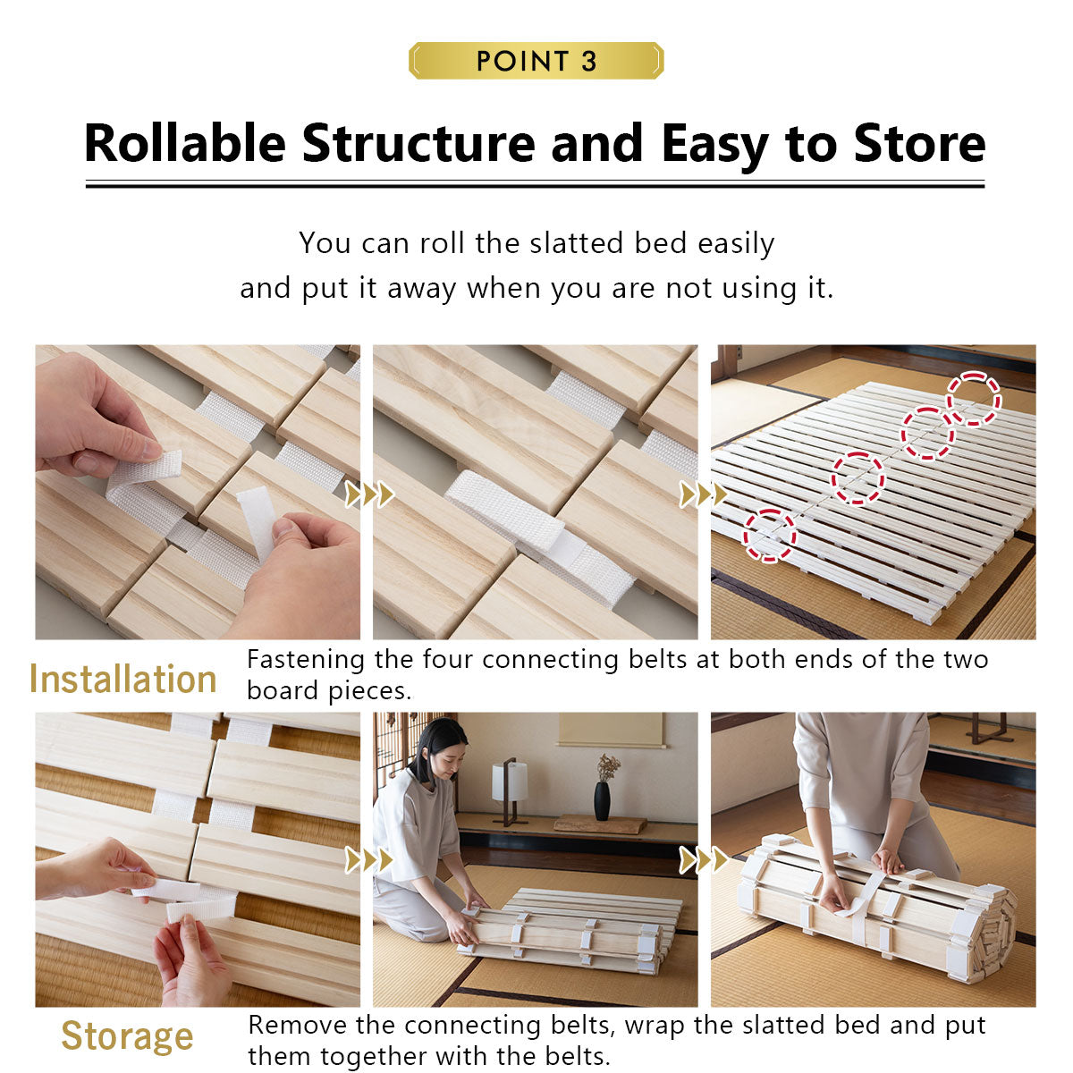 Dieser rollbare Futon-Lattenrost hilft Ihnen, Ihren Platz effektiver zu nutzen. Sie können das Gestell tagsüber zusammenrollen und so die Platzausnutzung maximieren.