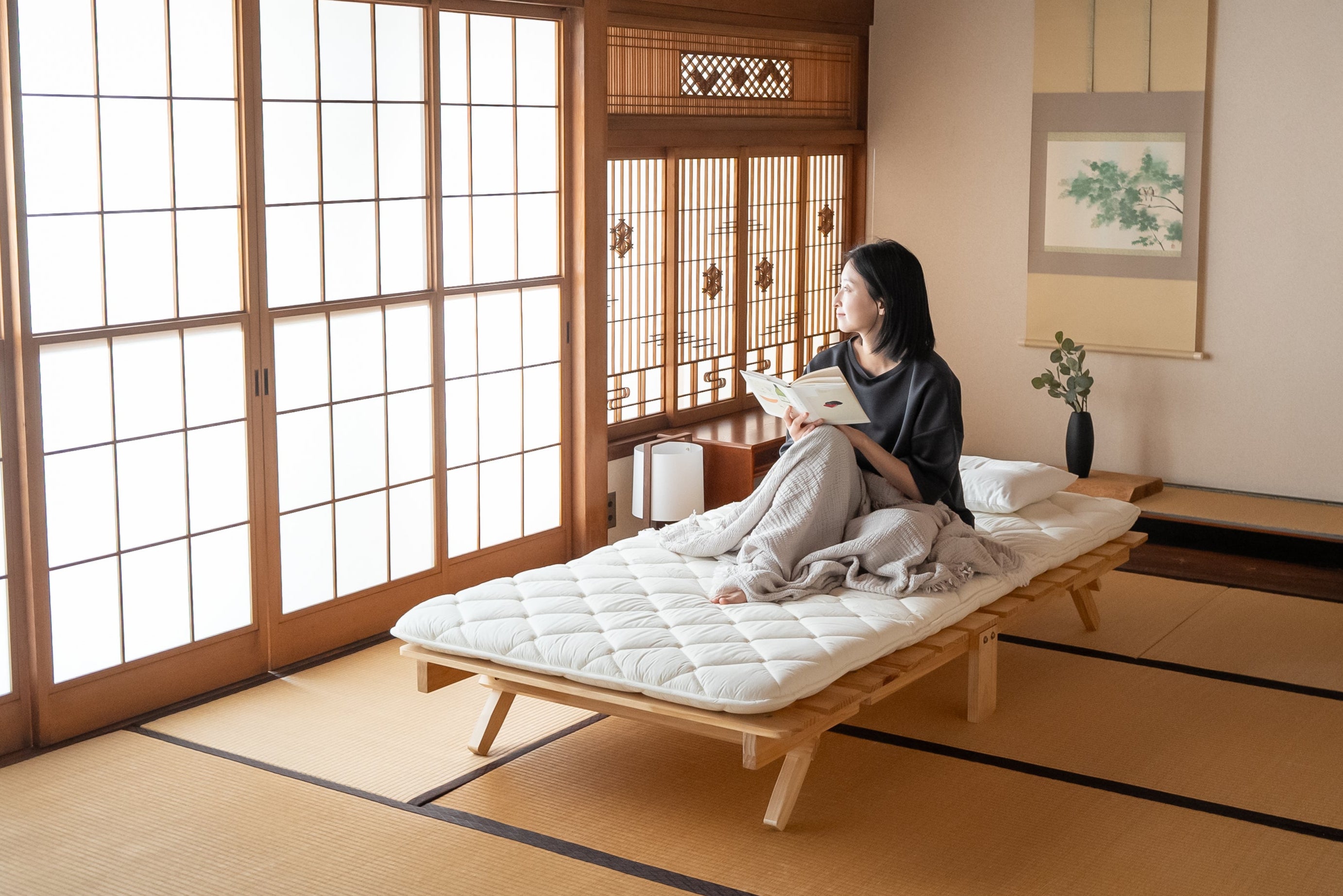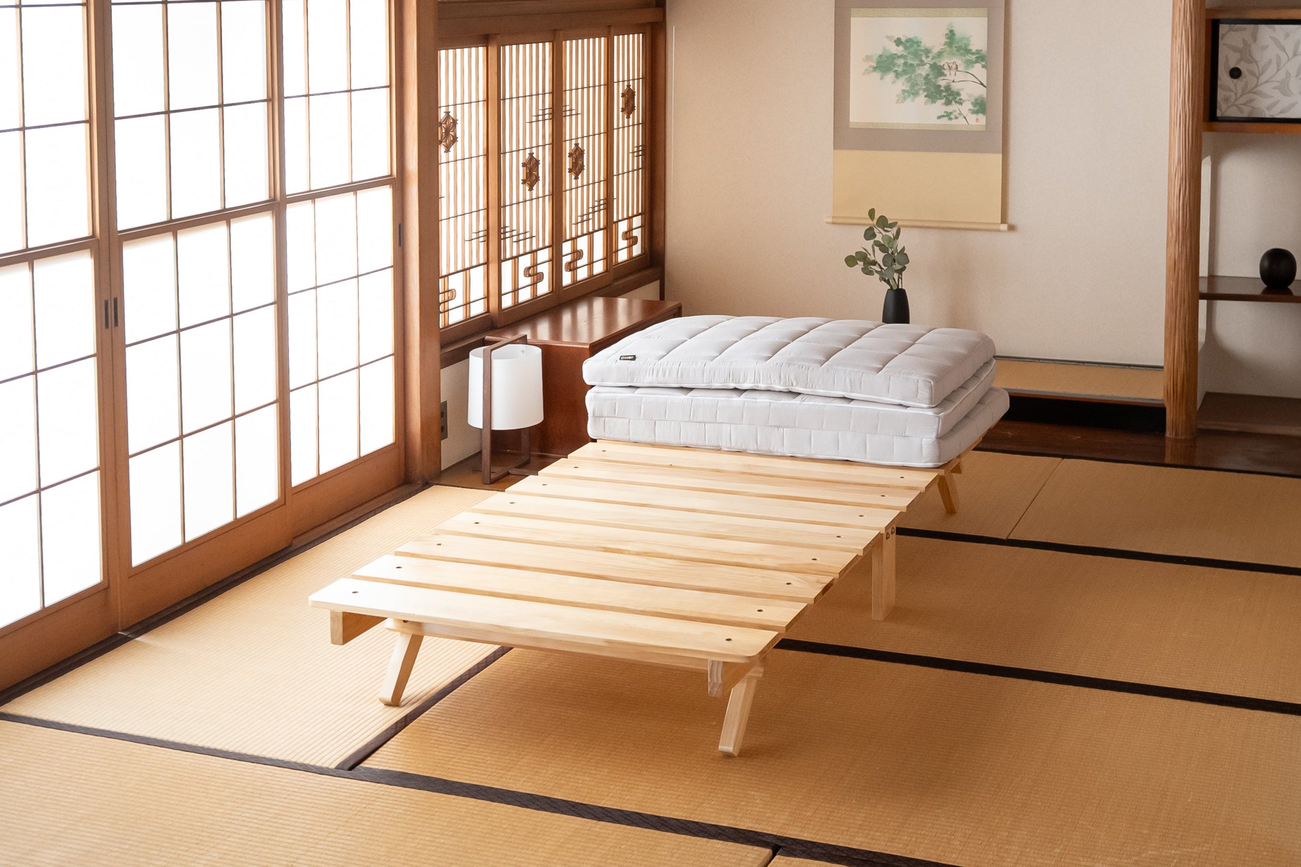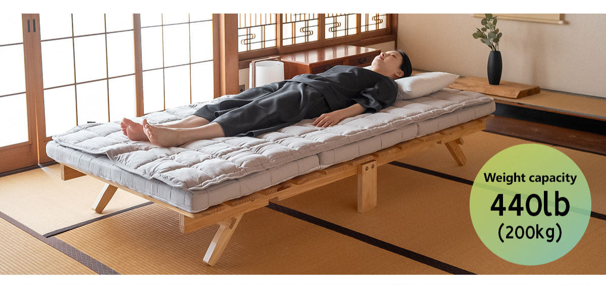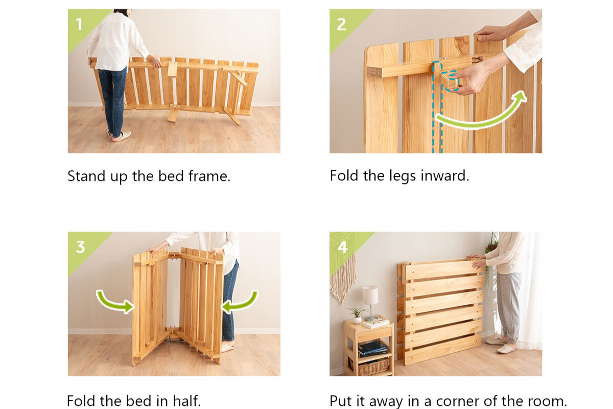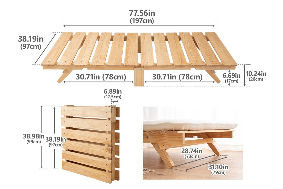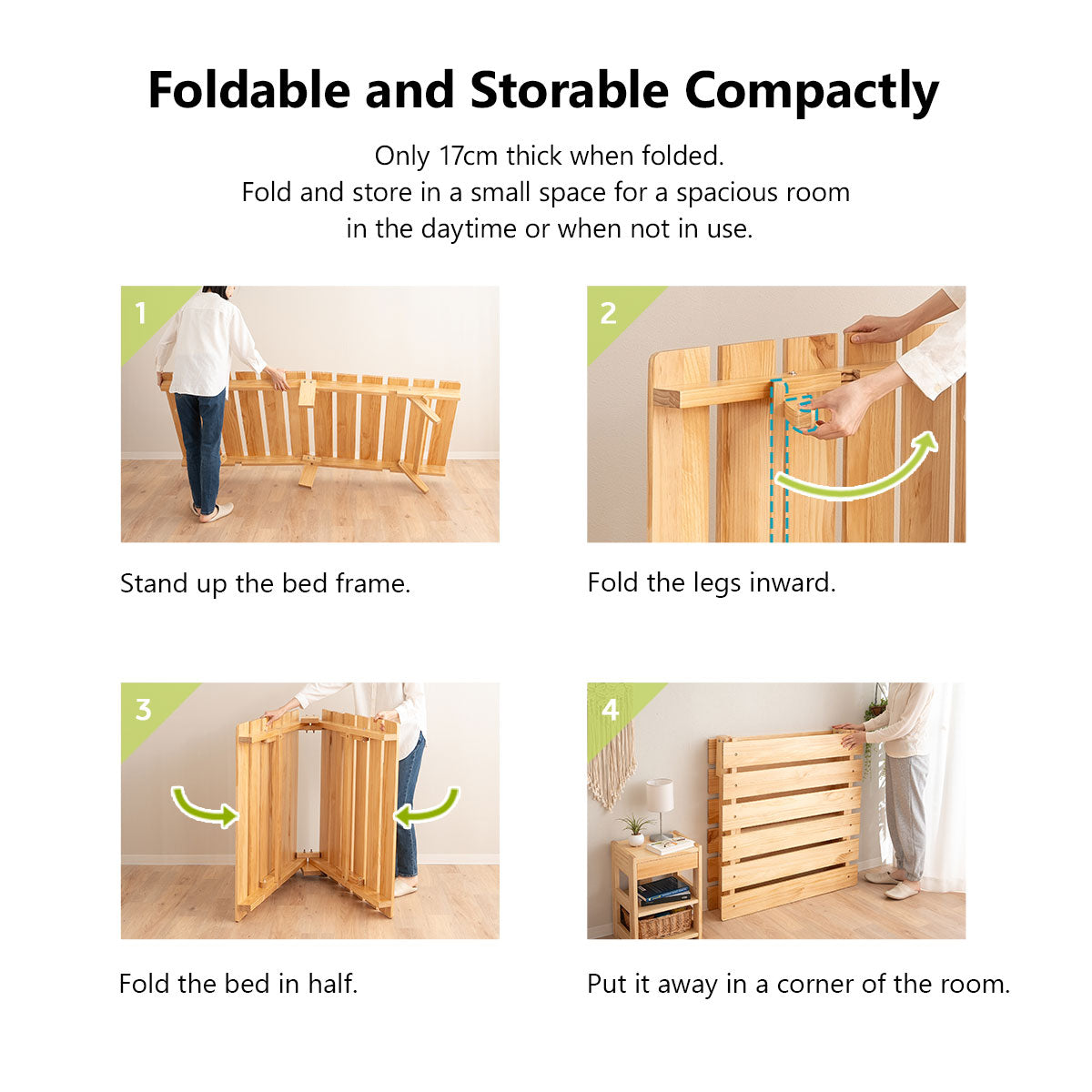 When folded, it is only 17 cm (6.69 inches) thick. Fold it up and store it in a small space to create a spacious room during the day when not in use. Fold up the bed and stand it upright to dry your futon and keep it clean.