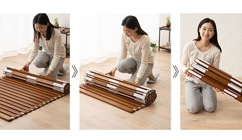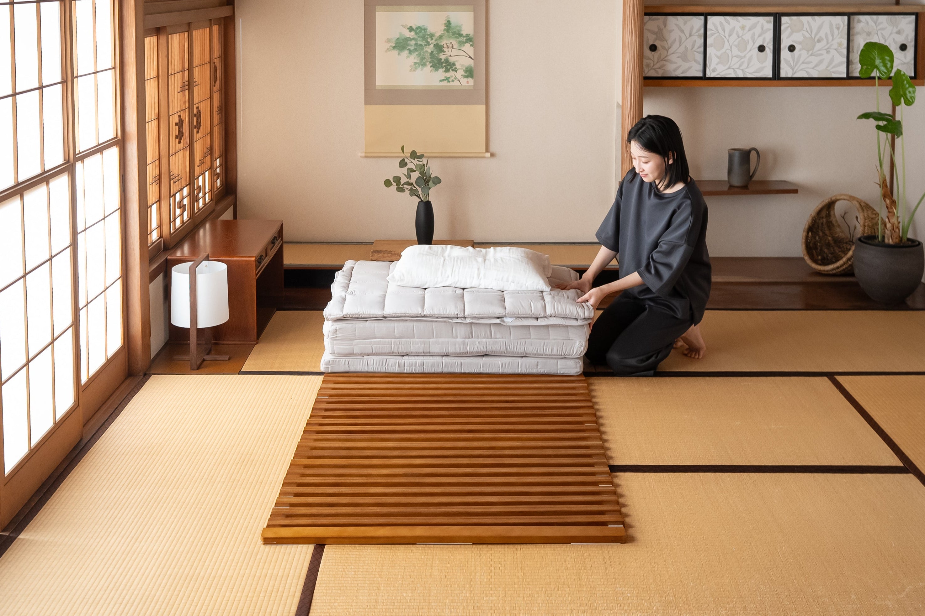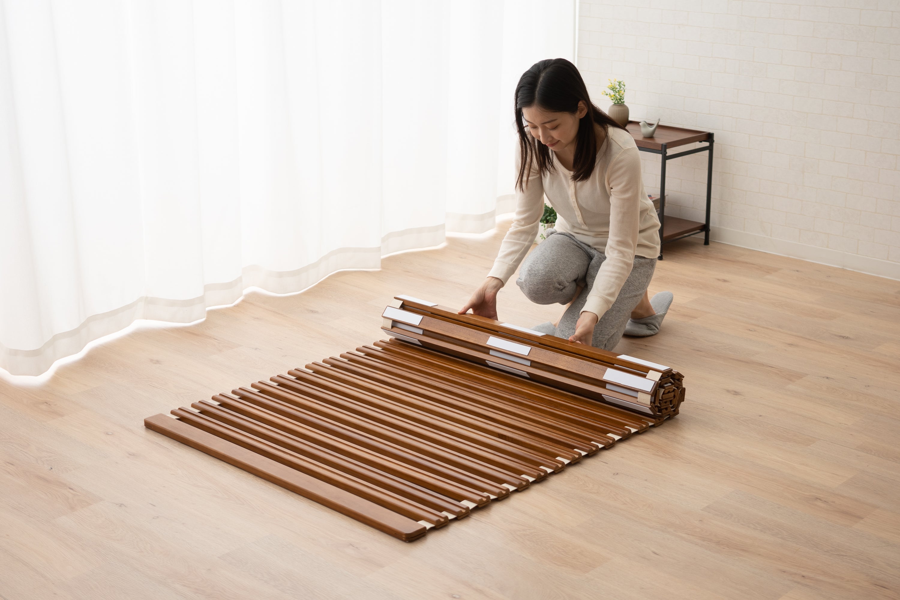Japanese futon beds do not require a bed platform. However, if you feel uncomfortable sleeping directly on the floor, the EMOOR OSMOS wooden roll-up bed is the perfect choice. It can be rolled up and stored in a closet or corner together with a foldable Japanese futon. You can use the space effectively. Perfect for minimalists, guests, frequent movers, or to save money and space.