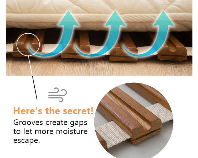 It is said that people sweat about 1-2 cups per night while sleeping. Futon mattresses can absorb sweat, but the floor cannot. A slatted frame helps futon mattresses release moisture. What makes the “EMOOR Wooden Slatted Frame OSMOS” special is that the grooves in each slat are designed to dissipate more moisture.